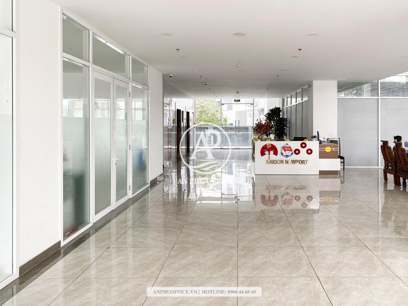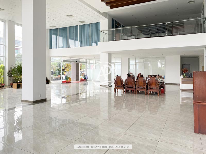 Bên trong, sảnh lễ tân gọn gàng, đủ tiêu chuẩn tiếp khách; điều hòa âm trần, sàn gạch men cao cấp, chiều cao trần hợp lý giúp không gian cho thuê văn phòng thông thoáng, phù hợp doanh nghiệp đông nhân sự và nhu cầu vận hành dài hạn.